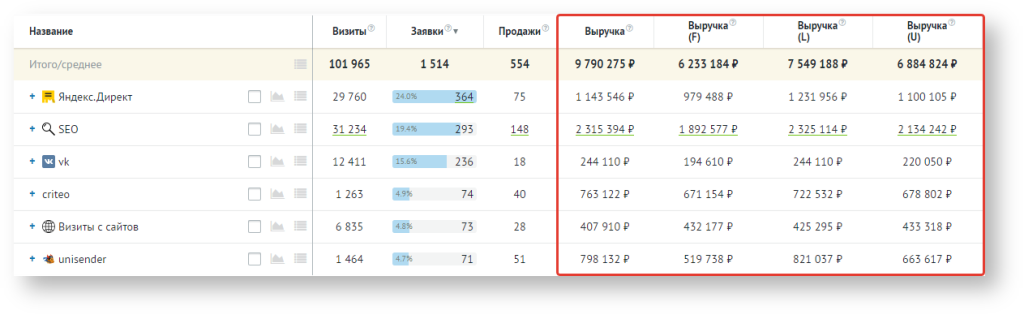 Разберём пример отчёта по источникам, где один и тот же показатель (например, выручка) отображается сразу в нескольких моделях атрибуции.