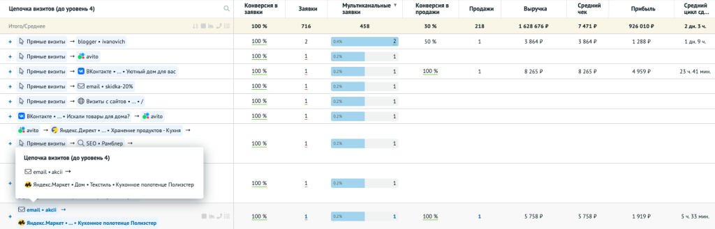 Отчёт входит в функционал «Мультиканальной аналитики» и показывает последовательность источников, через которые проходит клиент до заявки и продажи. Разберём пример.