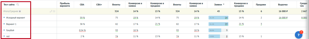 В нём показано, что тест может включать несколько вариантов (исходный вариант + варианты 1/"Голубой"/"red«), а сравнение идёт в одной таблице.