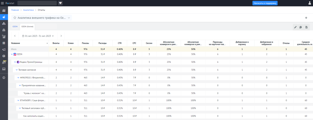 Отчёт раскладывает результат по уровням (например: Ozon → «Яндекс ПромоСтраницы» → кампания → объекты) и сразу сопоставляет расходы с действиями на карточках и конверсиями. Это удобно для быстрой диагностики: видно, где есть показы и клики, но нет переходов в карточки или добавлений в корзину.