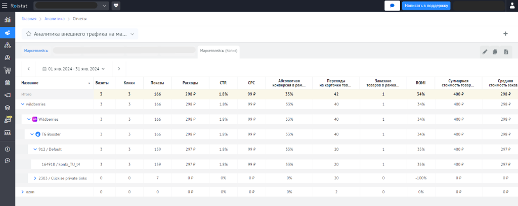 Этот отчёт нужен для оценки эффективности внешнего трафика на карточки маркетплейсов. В одном окне собраны базовые рекламные метрики — визиты, клики, показы, расходы, CTR, CPC — и поведение пользователя уже внутри площадки.
