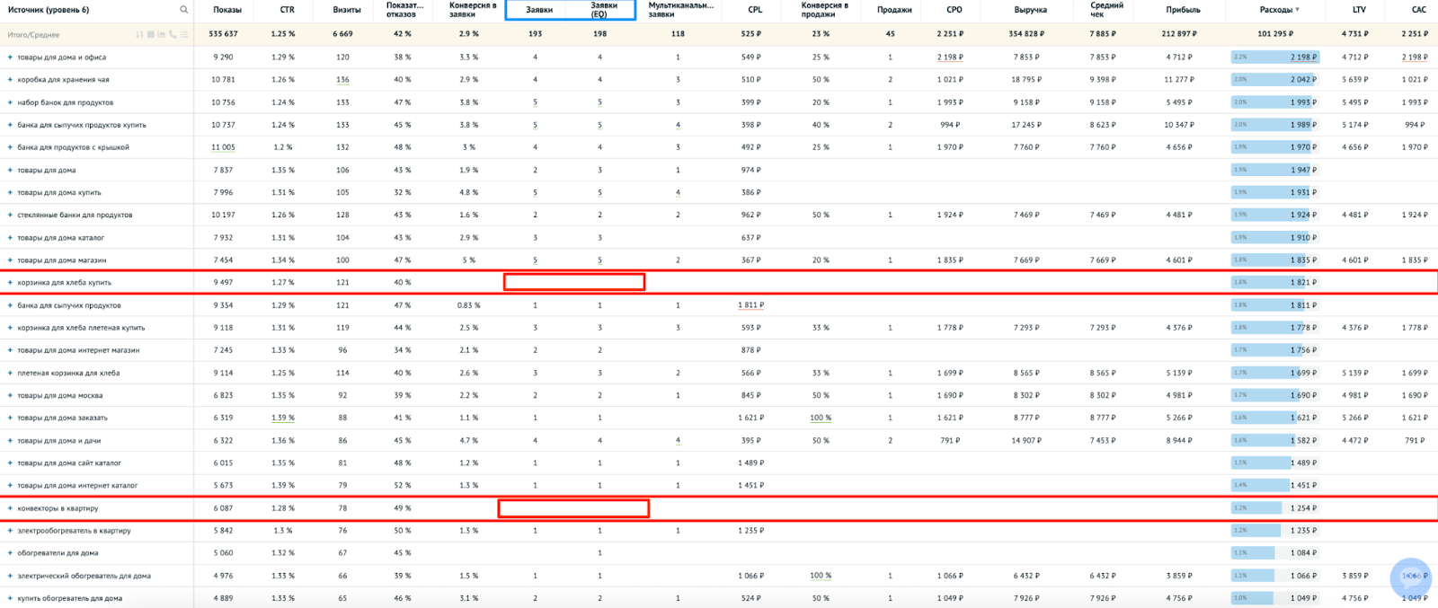 - После сохранения проводим анализ эффективности ключевых слов «Яндекс плюс Директ», учитывая все показатели воронки.