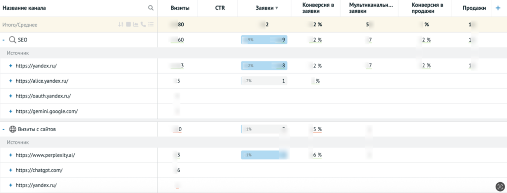 Отчёт показывает, сколько визитов, заявок и продаж приходит с каждого ИИ-сервиса.