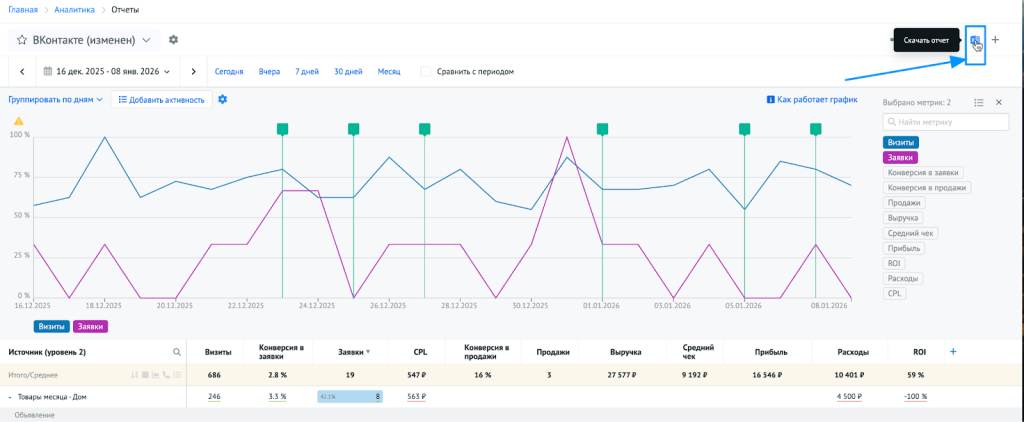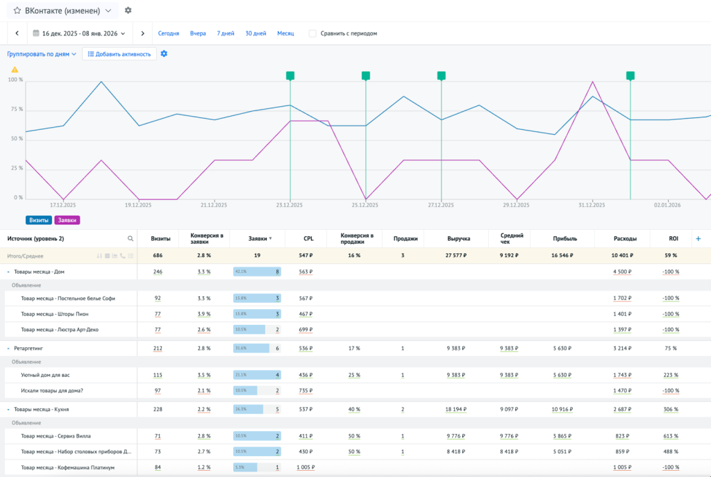 - Откройте в Roistat отчёт по нужному каналу — например, ВКонтакте — с группировками по кампаниям и объявлениям. Добавьте ключевые метрики: расходы, визиты, лиды, CPL, конверсию, выручку, ROI.