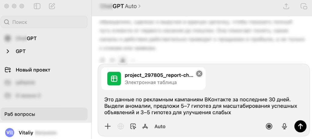 - Загрузите таблицу в нейросеть, например, ChatGPT. Задайте конкретный запрос: «Это данные по рекламным кампаниям за последние 30 дней. Выдели аномалии, предложи 5–7 гипотез для масштабирования успешных объявлений и 3–5 гипотез для улучшения слабых».