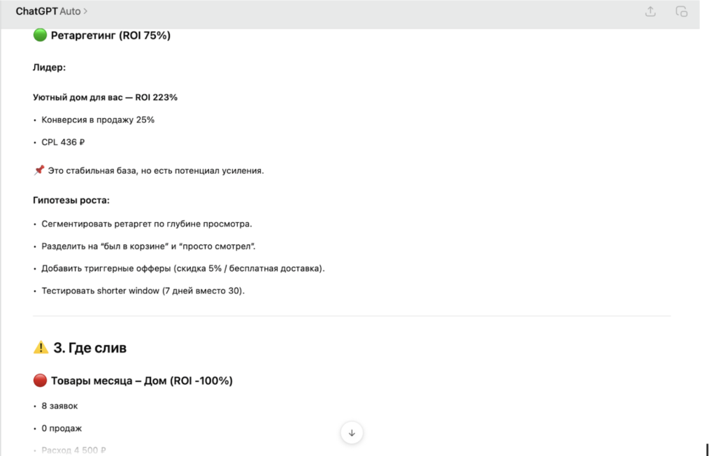 Структурированный список гипотез, которые можно проверить. ИИ хорошо замечает паттерны в данных — например, что одно объявление с высоким CTR даёт низкую конверсию в сделку или что кампания с дорогим CPL при этом показывает лучший ROI за счёт высокого среднего чека.