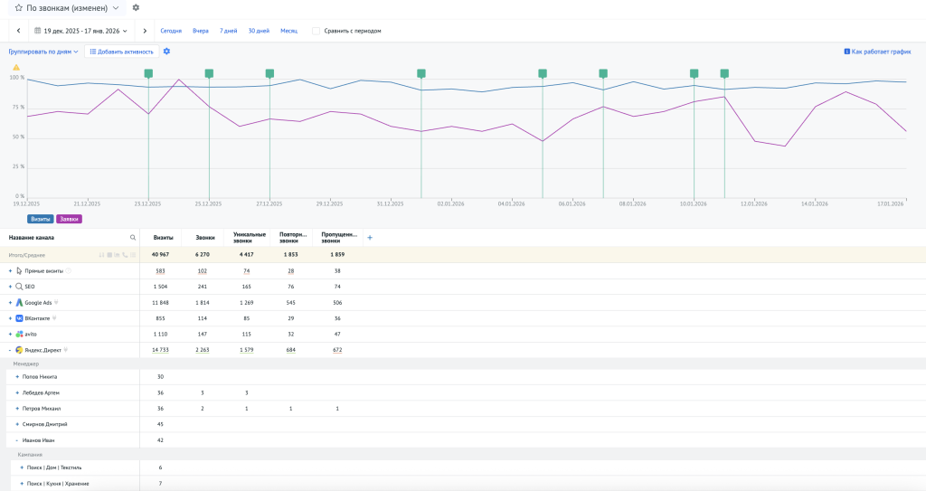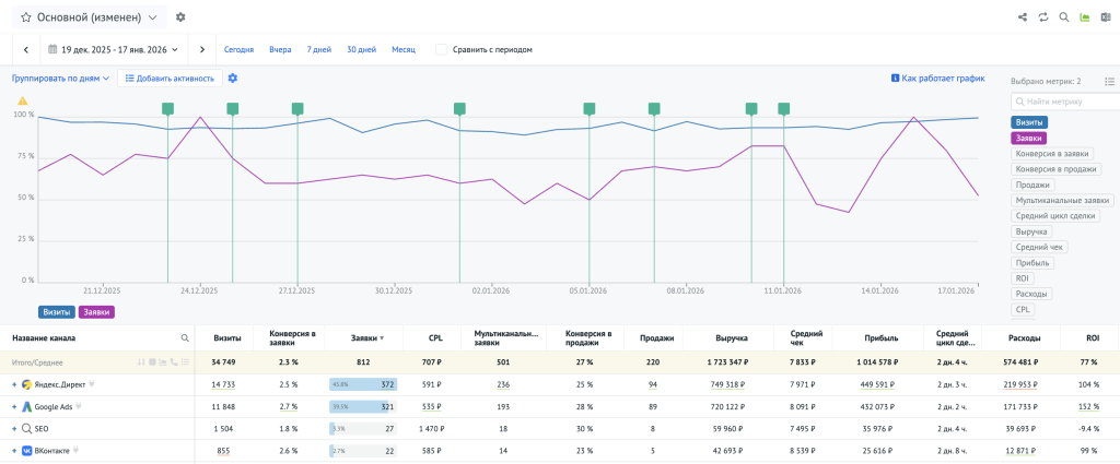 Это позволяет оценивать эффективность каналов по полной связке: источник → действия на сайте → этапы продаж → результат.