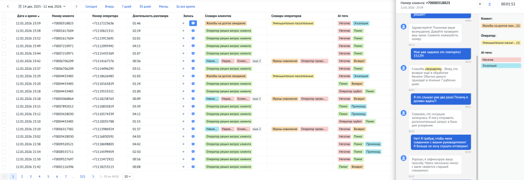 Речевая аналитика работает со звонками: хранит историю и записи, позволяет искать и фильтровать разговоры, использует ИИ для разметки и анализа коммуникаций — темы, ключевые фразы, причины отказов, качество обработки.