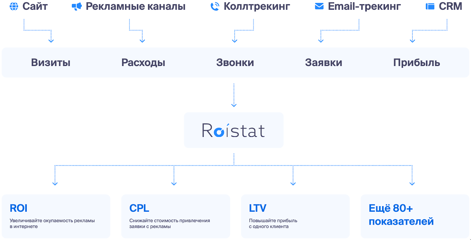 - сквозная аналитика с интеграцией сайта, рекламных кабинетов и 1C-CRM;