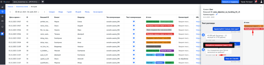 Аналитика чатов выполняет аналогичную функцию для переписок: фиксирует диалоги из подключённых каналов, оценивает скорость ответа, полноту консультации, соблюдение регламентов и причины остановки разговора.