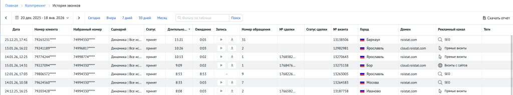 В Roistat влияние звонков можно анализировать и в сквозной аналитике благодаря связке коллтрекинга с источниками, визитами и продажами.