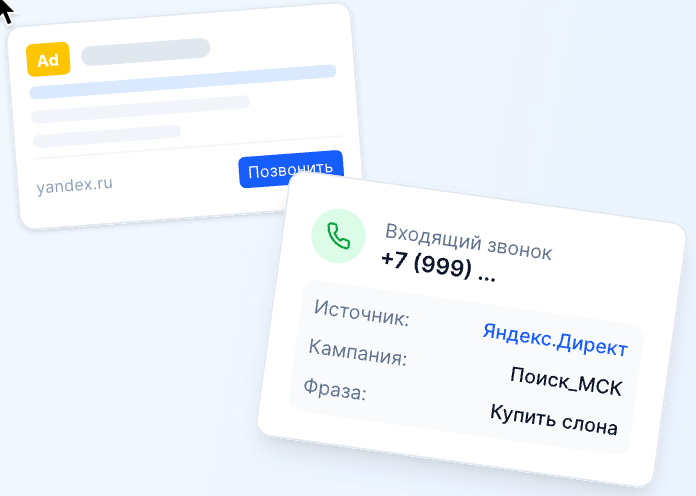 - Динамический — для онлайн-источников — каждый входящий звонок фиксируется с привязкой к источнику: рекламной кампании, ключевому слову, посадочной странице или офлайн-носителю.