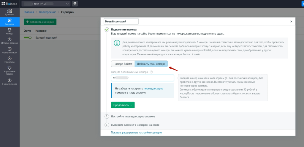 Сценарий подходит компаниям, которые уже используют свою телефонию и не хотят менять провайдера. Номера подключаются к коллтрекингу Roistat по инструкции, после чего звонки фиксируются в проекте и связываются с источниками обращений.
