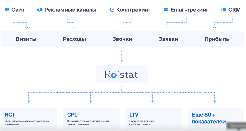 После проведения интеграции с сервисами Roistat формирует единый массив данных — то есть:
