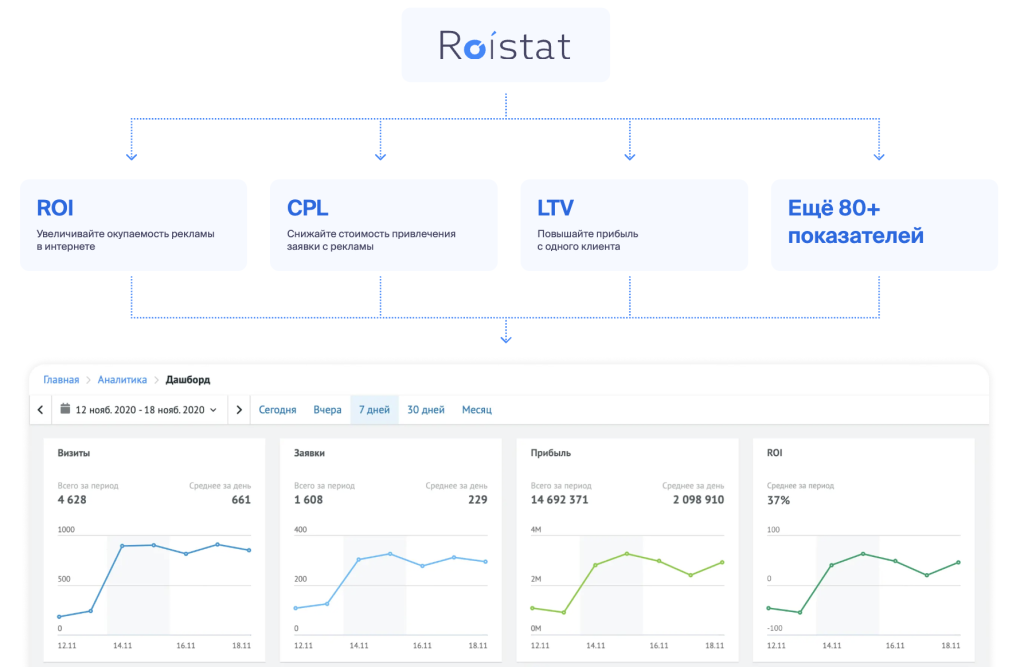 Компания использовала разные каналы: контекст, SEO, соцсети, рассылки. Для управления бюджетом им понадобилась прозрачная статистика. Интеграция с Roistat позволила провести аудит рекламных кампаний (в частности, «Яндекс Директ») и отслеживать ключевые показатели: CPL и CPO.