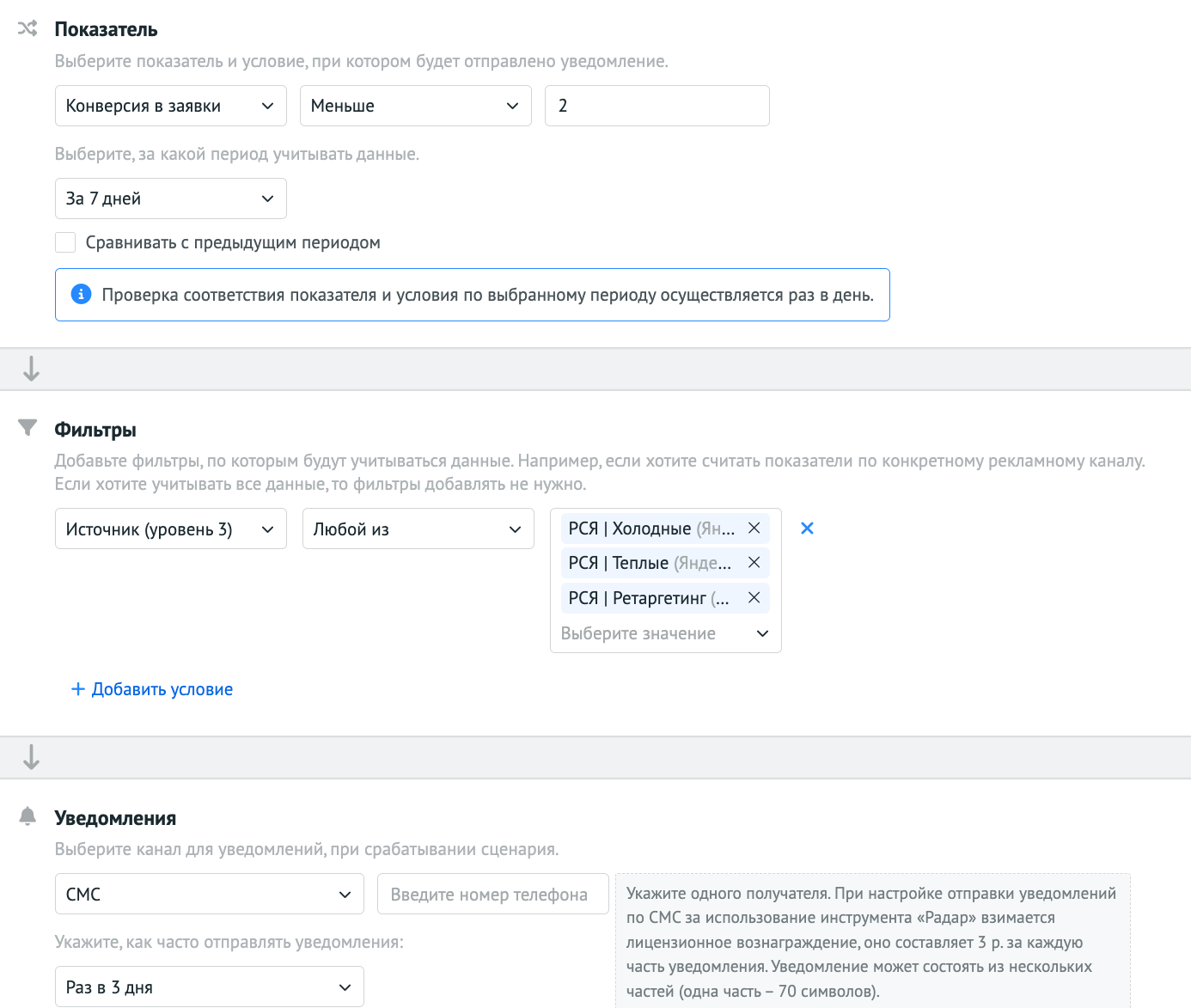 В инструменте «Радар» можно настроить автоматические оповещения об отклонениях ключевых показателях. Система следит за метриками в режиме реального времени и мгновенно сообщит об их изменении. Например, если:
