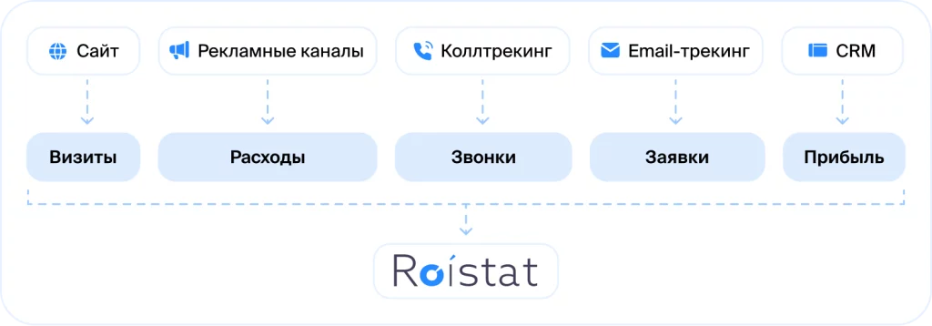 Для неё Roistat создаёт единый контур, который собирает данные из CRM, телефонии, рекламных систем, ERP и сайтов.