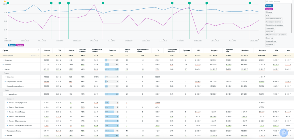 - Перераспределите бюджет в пользу регионов, где ROMI/ROI и прибыль выше среднего по аккаунту и при этом стабильно сохраняется конверсия в продажу, а не только в заявку.