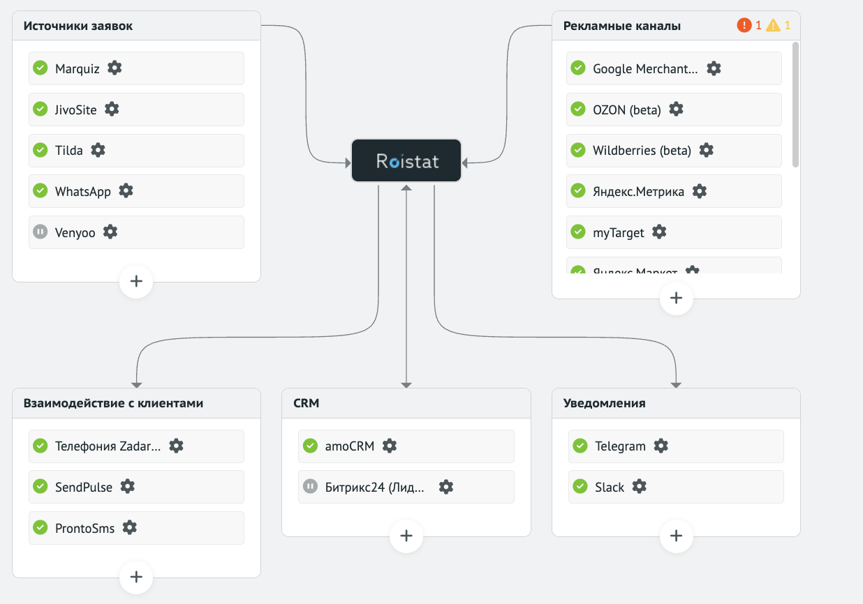 Затем в каталоге интеграций подключаются CRM, виджеты и рекламные кабинеты. Так подтягиваются расходы, заявки, фактические продажи и т.д.