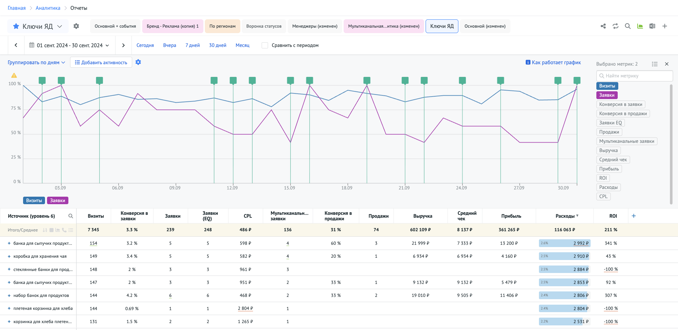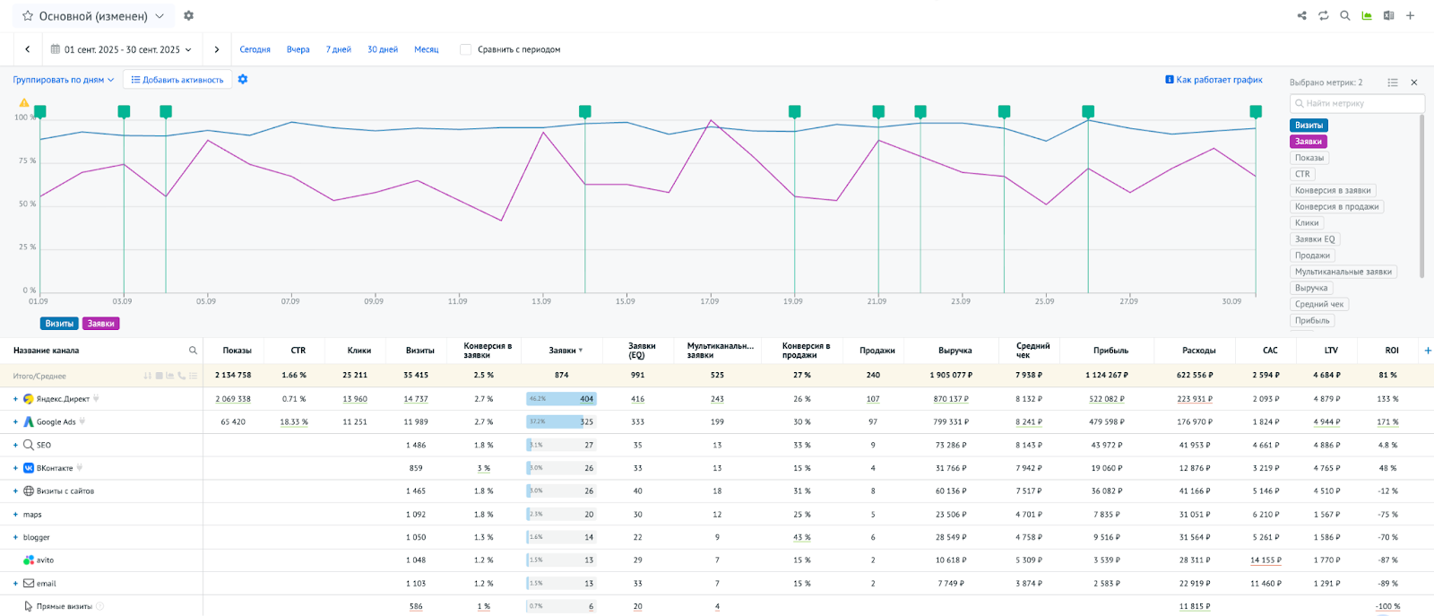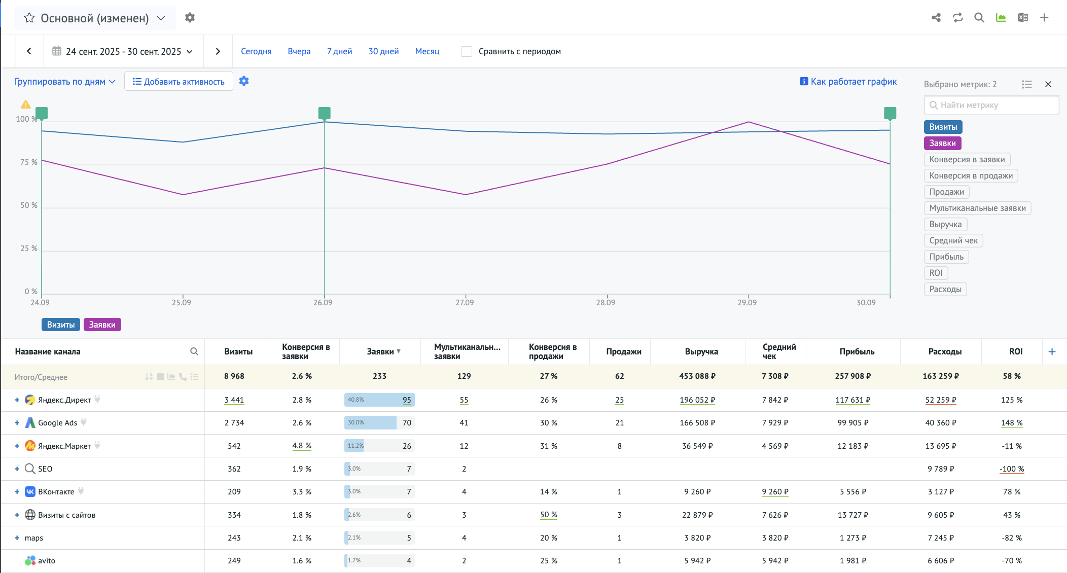 Так, даже в базовом отчёте по каналам руководителю для проверки будет доступна вся воронка — от показов до продаж. Этого уже достаточно, чтобы понять, какие каналы приносят результат, где теряются заявки и что следует починить.