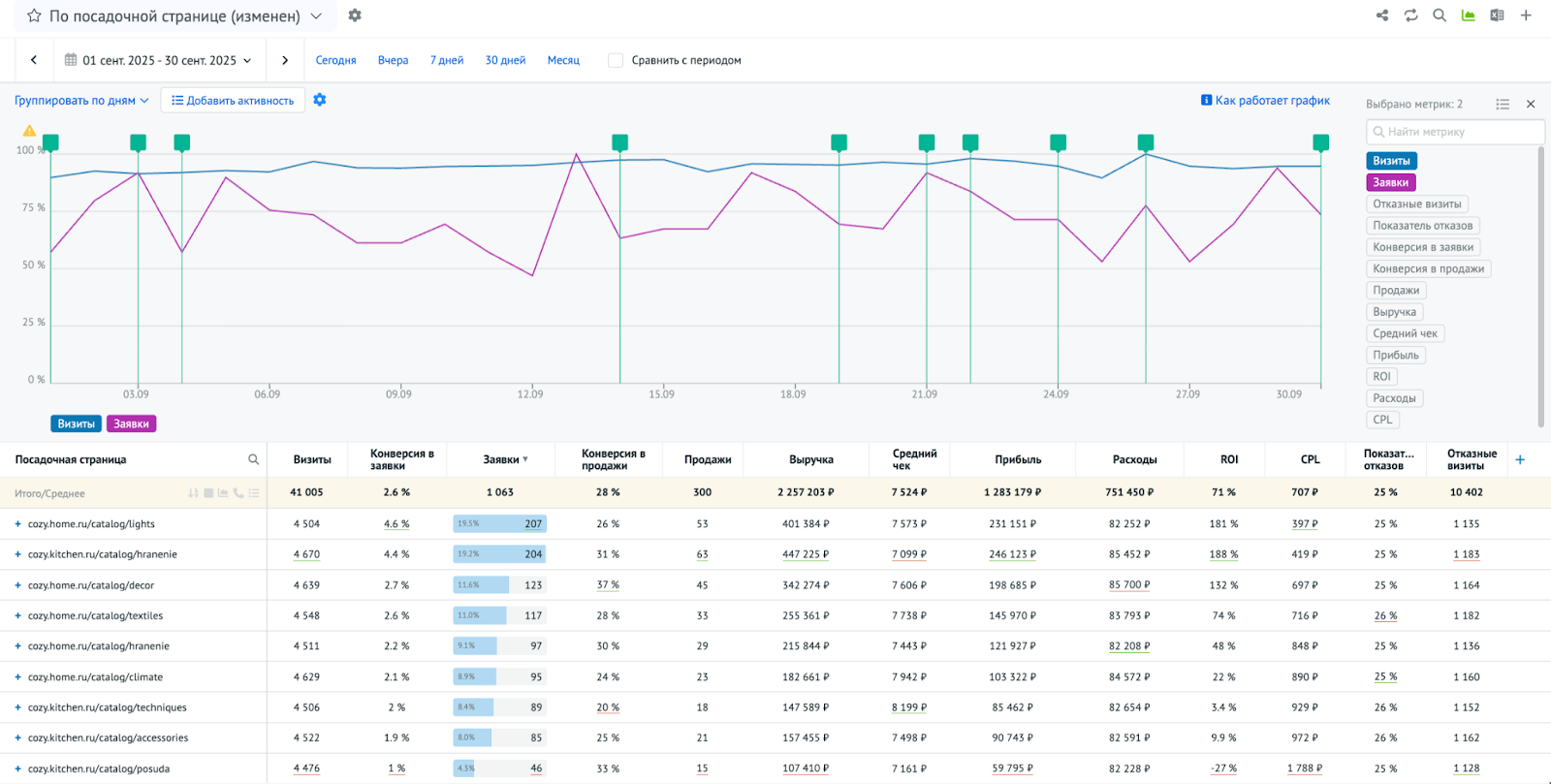 Покажем пример работы с отчётом. Страницы /catalog, /lights — выступают лидерами, так как имеют наилучшие показатели в конверсию в заявку: 4,6% (ROI = 181%, CPL = 397₽).
