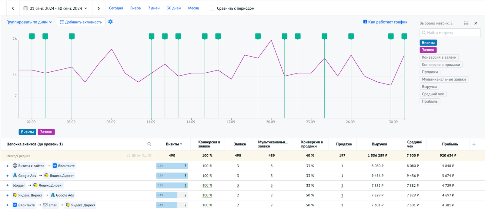 Показывает результативность каналов с учётом всего пути клиента: видно, что подогревают интерес, а что — закрывает сделку.