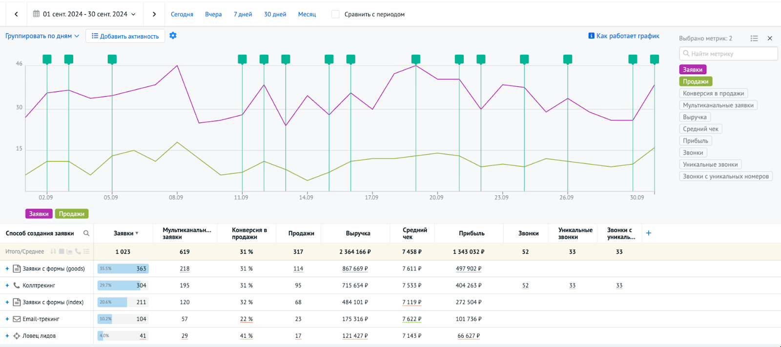 Отчёт показывает, как появилась заявка: с формы на сайте, звонка, email, «Ловца лидов» и т.п. А также во что она конвертировалась и сколько денег принесла. Отдельно отображаются доля мультиканальных обращений и метрики по звонкам.