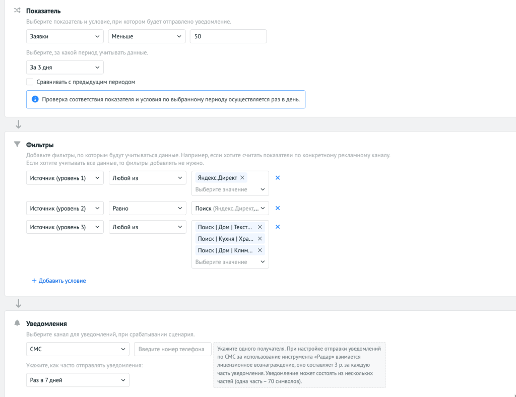 Вы задаёте, что для вас важно: число заявок, стоимость лида, конверсия, сумма сделок. Устанавливаете порог (например, «заявок не меньше 50 в неделю») и фильтры (по каналам, кампаниям).