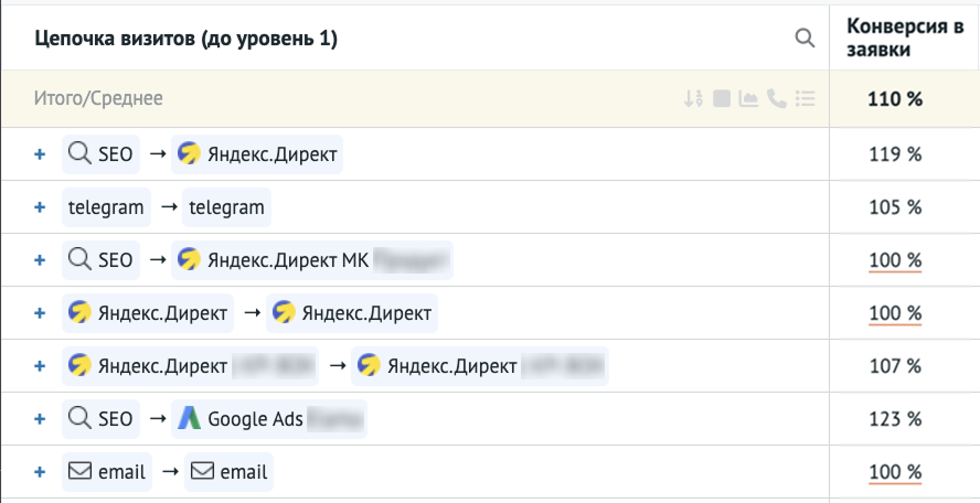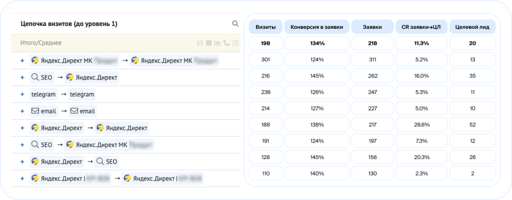 Решения по бюджетам принимаем на уровне цепочек: усиливаем каналы, которые регулярно входят в последовательности с высоким числом целевых лидов. Например, «Яндекс Директ МК → Яндекс Директ 1»: она даёт много визитов, заявок и «прогретых» клиентов. Это сильная связка внутри контекста, поэтому ёё поддерживаем и аккуратно масштабируем.