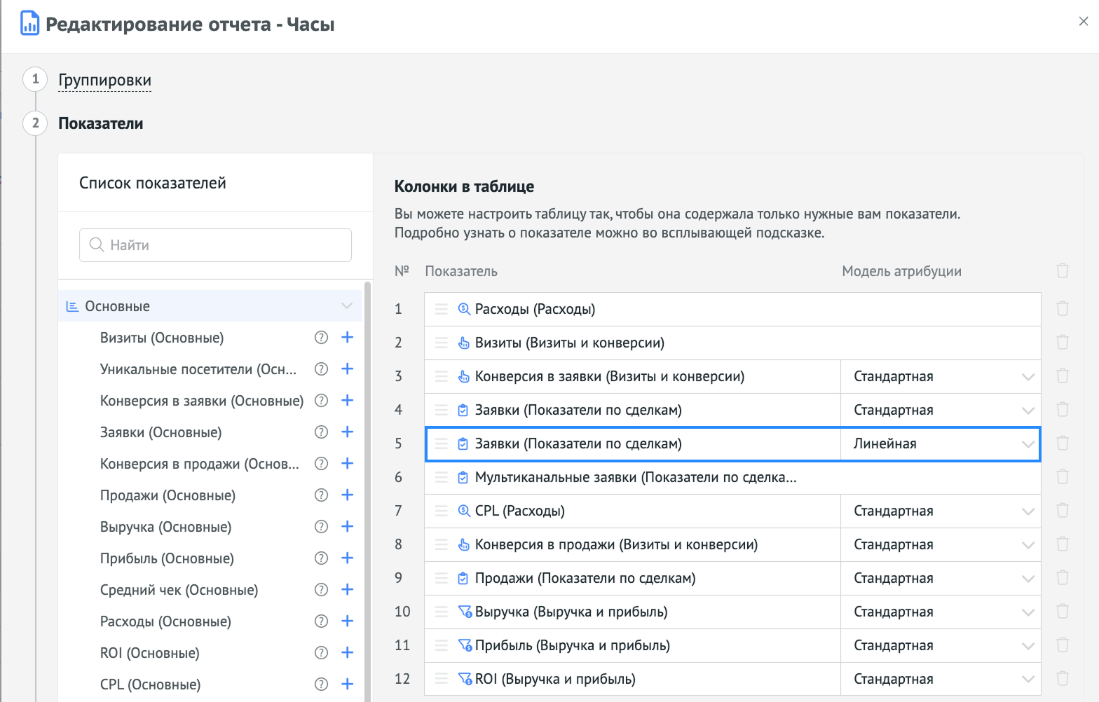 - В заранее созданный отчёт добавляем заявки по модели атрибуции «Линейная» для оценки вклада по времени: