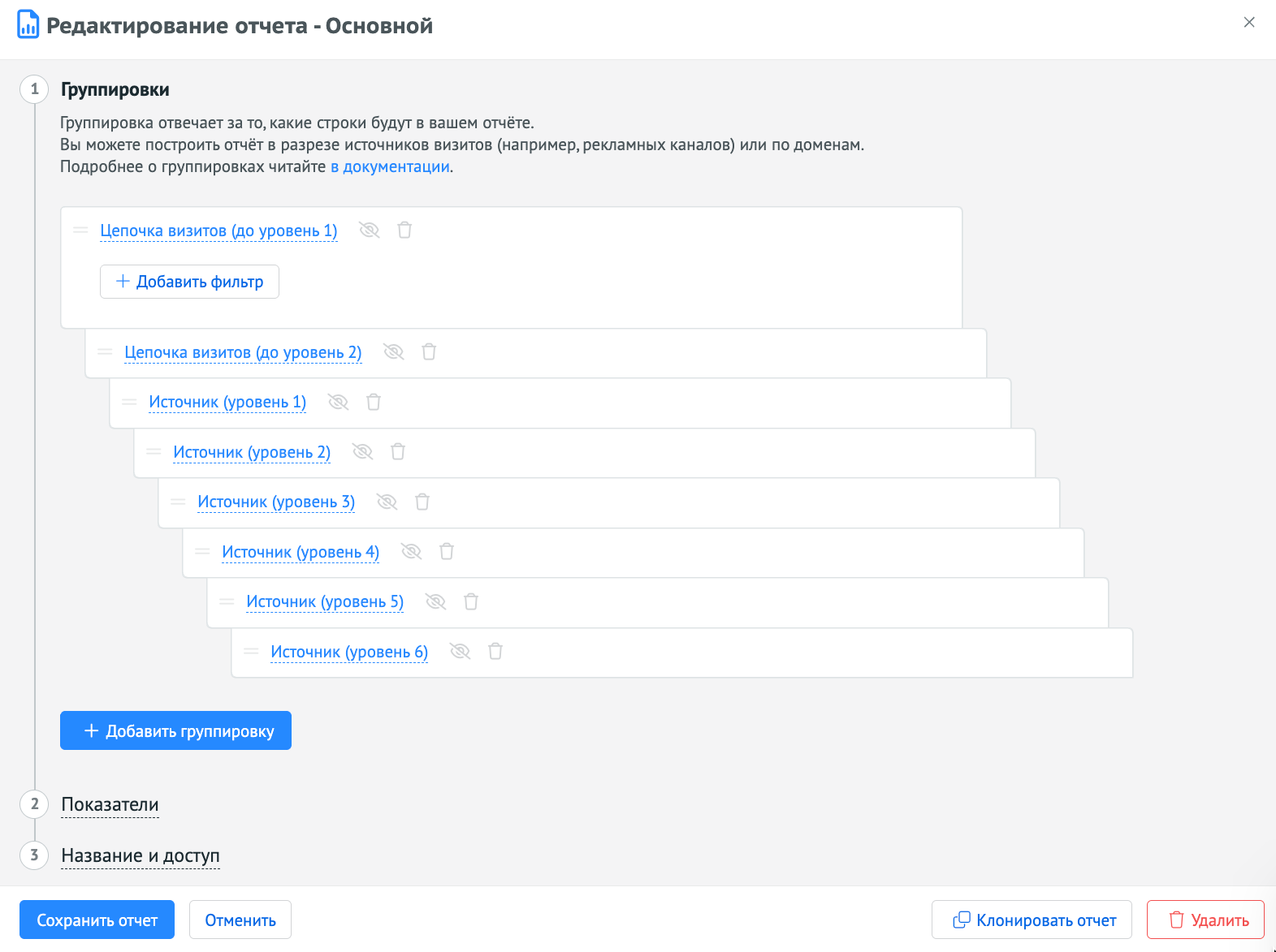- В новом отчёте добавляем группировку «Цепочка визитов» до 1 и 2 уровня и выбираем необходимые метрики. У нас — заявки, конверсии и «Целевой лид»: