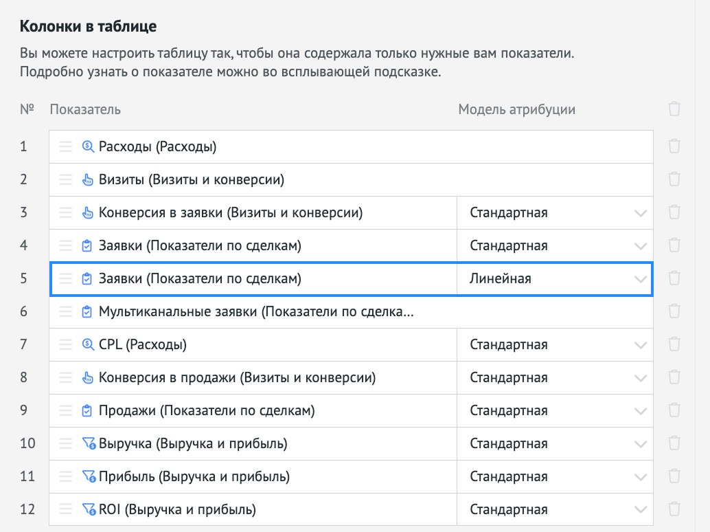 Она применяется в настройках отчёта к разным метрикам (выручке, ROI, CPL, конверсиям и др.) и показывает, как меняется вклад каналов: