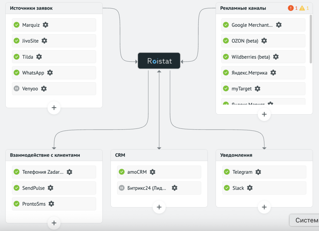 Roistat подключается к CRM и рекламным каналам через готовые коннекторы — всего доступно более 200 интеграций.
