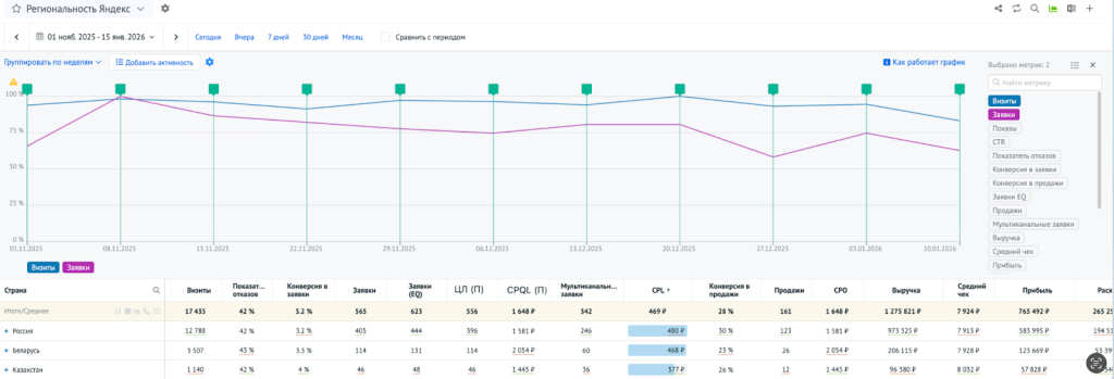 Для B2B в него обычно добавляют следующие показатели: CPQL, цикл сделки, ROI, прибыль и конверсию в заявки и продажи. Когда эти метрики собраны в одном отчёте, картина эффективности каналов становится значительно точнее.