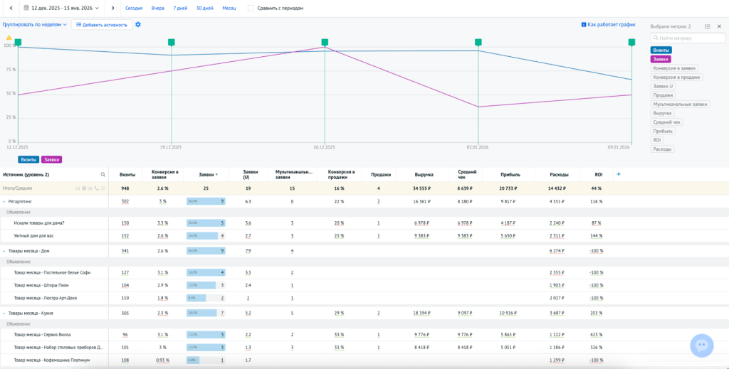 Во-вторых, выручку нужно связывать с исходным источником привлечения, а не с датой активности рекламы. Клиент мог прийти в июле, а оплатить в октябре — и эту сделку никак нельзя относить к «октябрьским кампаниям».
