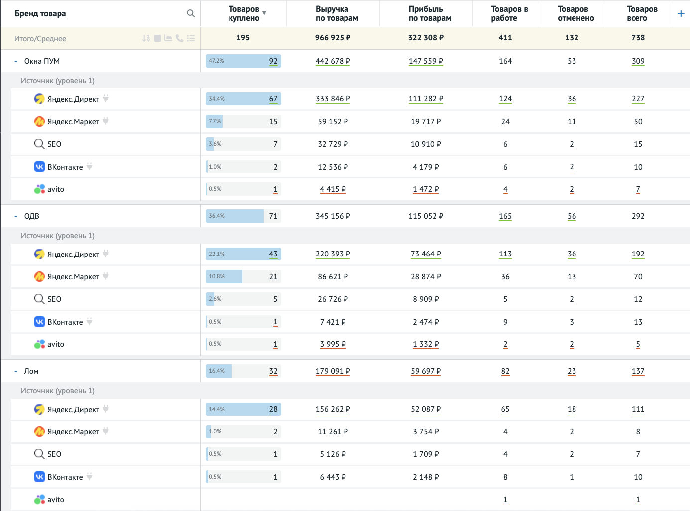В отчёте видно, что по всем товарам основную долю покупок формирует Яндекс.Директ и наибольший вклад в прибыль. Это указывает на аудиторию с уже сформированной потребностью: клиент приходит с чётким запросом и готов выбирать конкретный бренд.