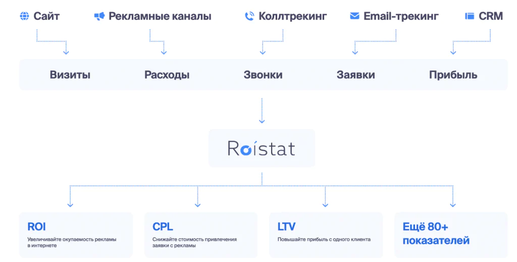 Roistat — это платформа для повышения эффективности маркетинга, которая объединяет данные по всем этапам взаимодействия с клиентом: от клика по объявлению до повторных продаж. Платформа собирает информацию из рекламных систем, сайтов, CRM, телефонии и других источников, сводит её в единую аналитику и даёт инструменты для работы с трафиком, лидами и клиентами.