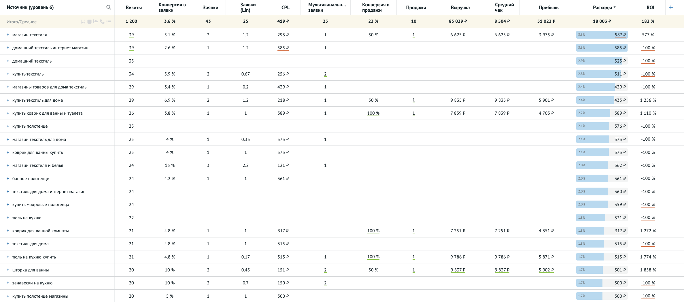 В отчёте видно, что общие запросы вроде «домашний текстиль», «текстиль для дома», «магазин текстиля» дают визиты и заявки, но чаще хуже дожимаются до покупки. В контексте анализа потребностей клиента это сигнал раннего этапа: человек ещё выбирает и уточняет критерии.
