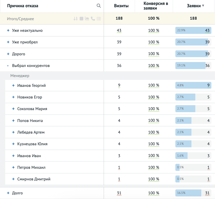 - Дополнительно для анализа потребностей полезно рассмотреть объединённый отчёт по причинам отказов и менеджерам, который покажет не просто факт потери клиента, а почему потребность не была закрыта.