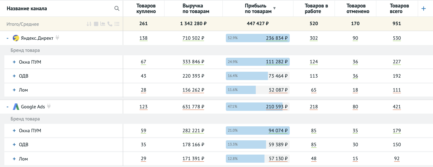 Инструмент позволяет анализировать продажи по товарам и категориям: какие позиции продаются лучше, из каких каналов приходят покупатели, что чаще всего становится первым заказом.
