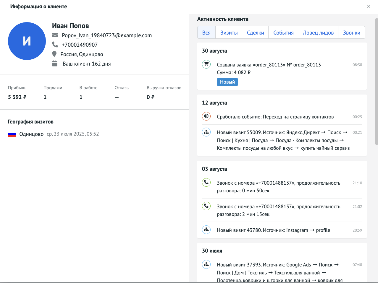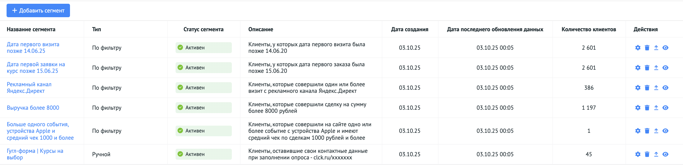 Инструмент собирает данные по каждому клиенту: визиты, каналы, сделки, выручку, активность, статусы и сегменты.