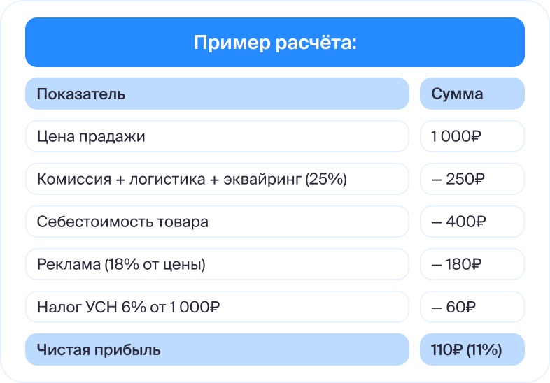 На цифрах: товар продан за 1 000₽. Маркетплейс удержал 200 ₽ (комиссия + логистика) и перевёл вам 800 ₽.