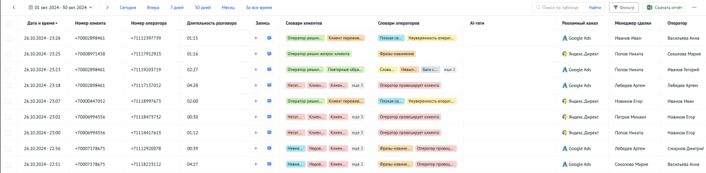 - Быстро выявлять риски: грубое общение, жалобы, сорванные сделки.