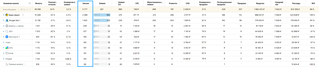 Благодаря связке звонков с конкретными источниками становится видно, какие каналы реально приводят телефонные обращения. А уже в сквозной аналитике эти данные объединяются с заявками и продажами, что позволяет проследить путь пользователя от первого касания до сделки.