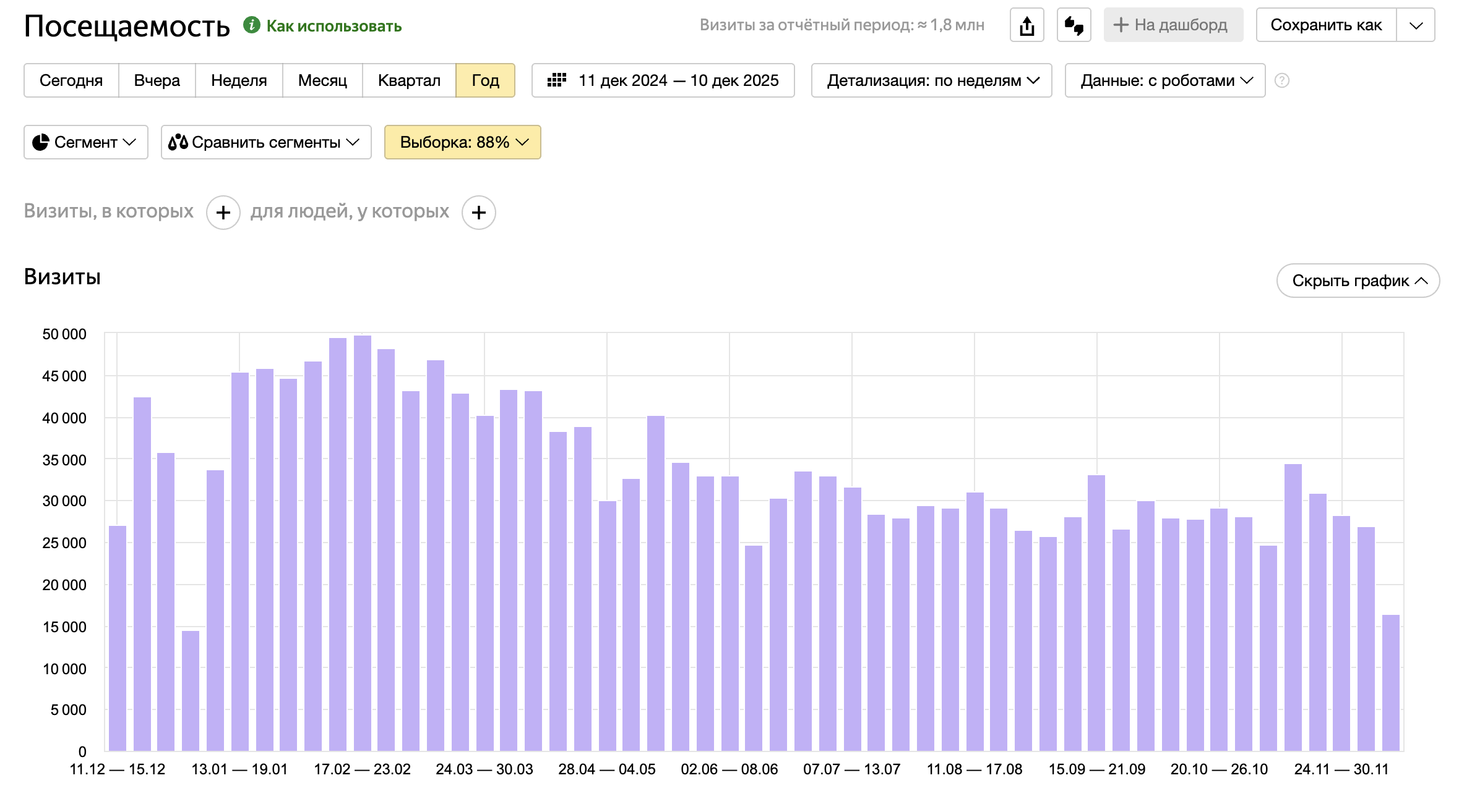 Показывает сколько человек зашло на сайт. В отчёте посещаемости есть два показателя: уникальные посетители и визиты. Визитов обычно больше, чем уникальных посетителей, потому что один человек может зайти на сайт несколько раз.
