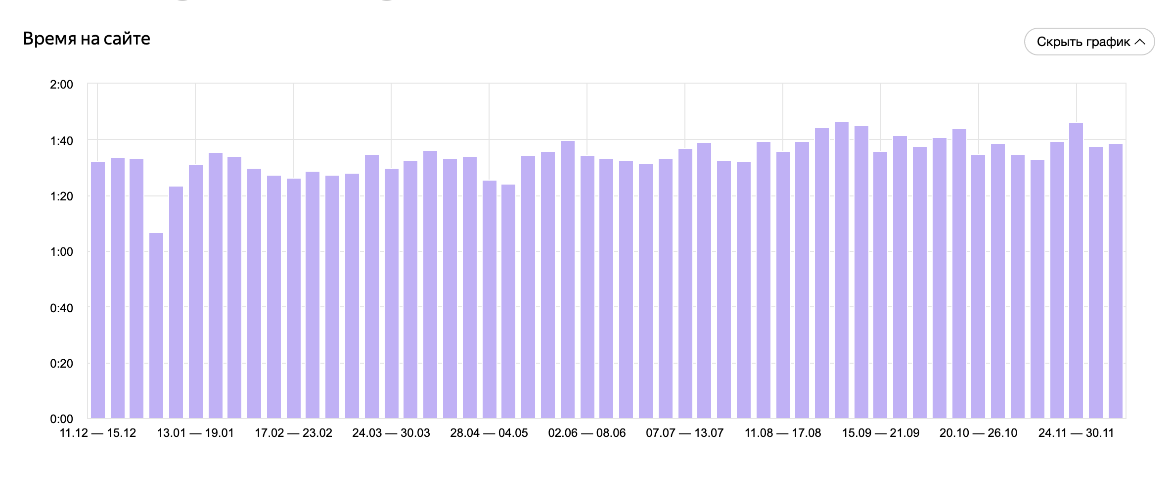 Показывает сколько в среднем пользователи проводят на вашем сайте. Если сайт нравится пользователям, они проводят на нём больше времени, потребляют больше контента и больше покупают.