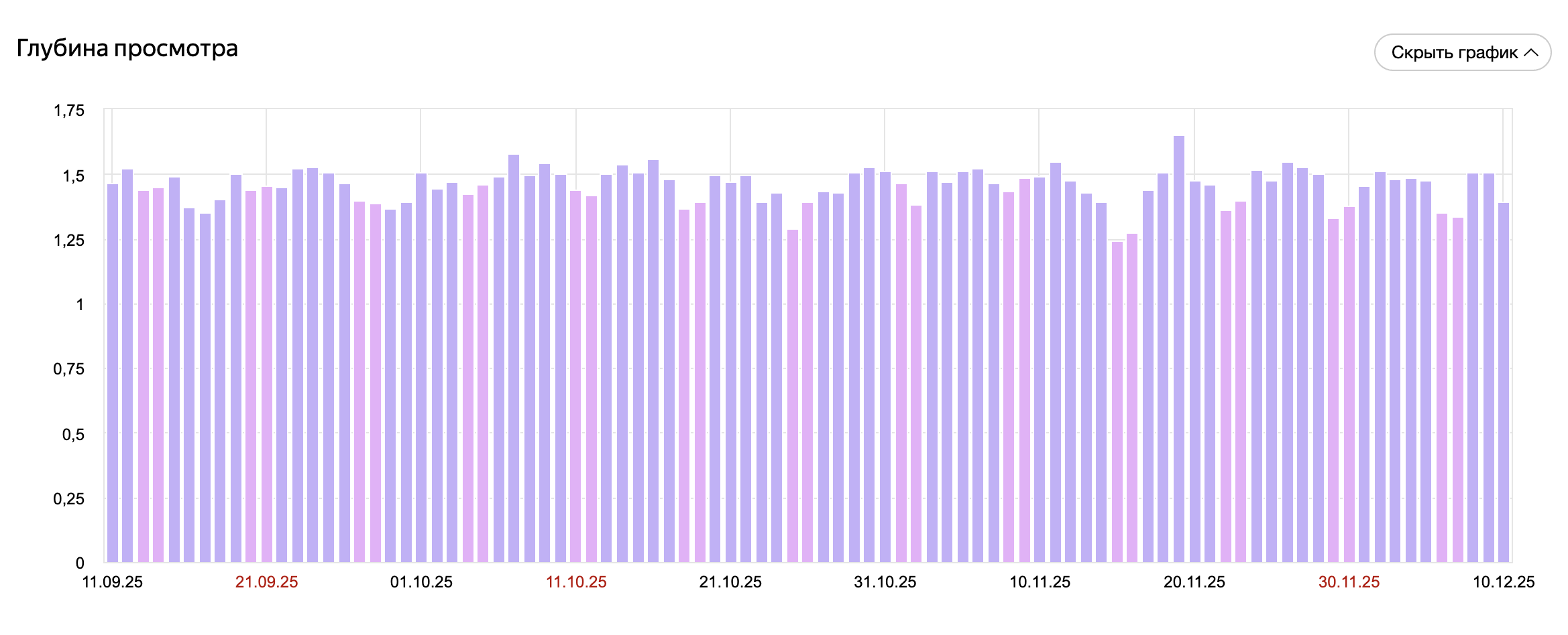 Глубина просмотра в Яндекс.Метрике: Отчёты → Стандартные отчёты → Аудитория → Глубина просмотра.