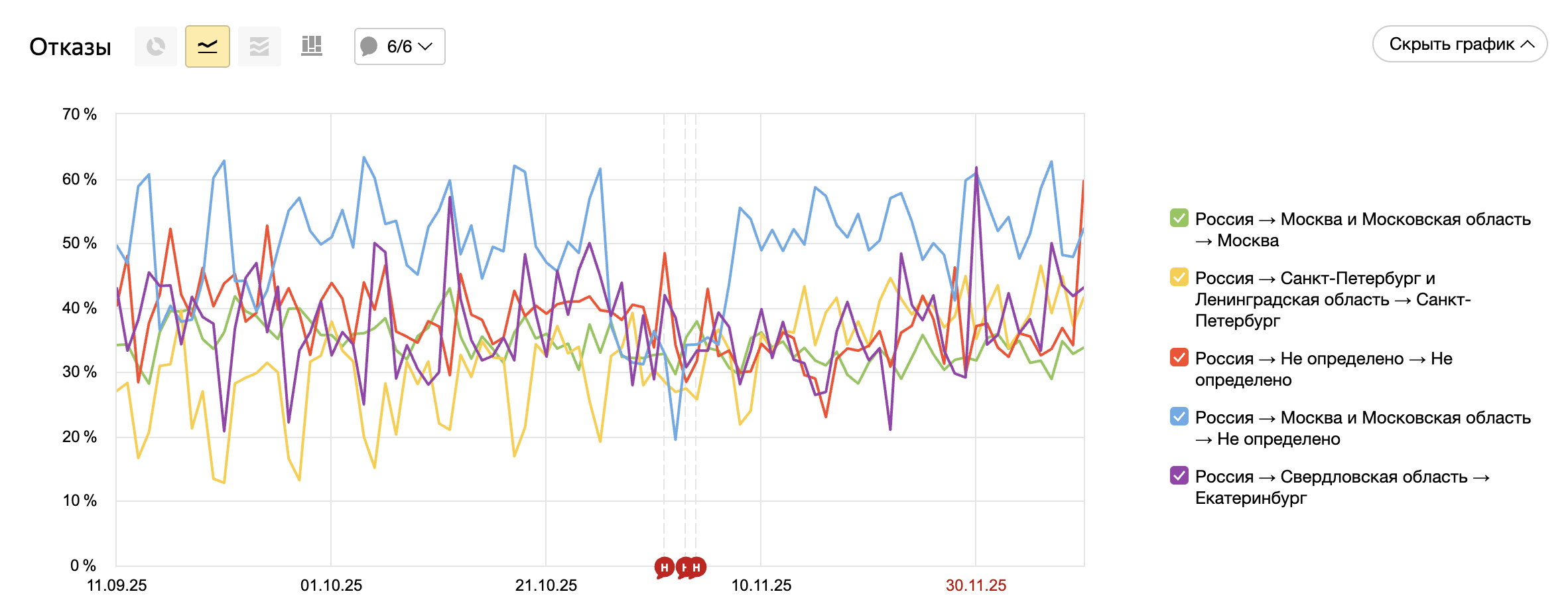 Высокий процент отказов — плохой знак. Этот показатель косвенно влияет на SEO-позиции и на цену клика в рекламе.