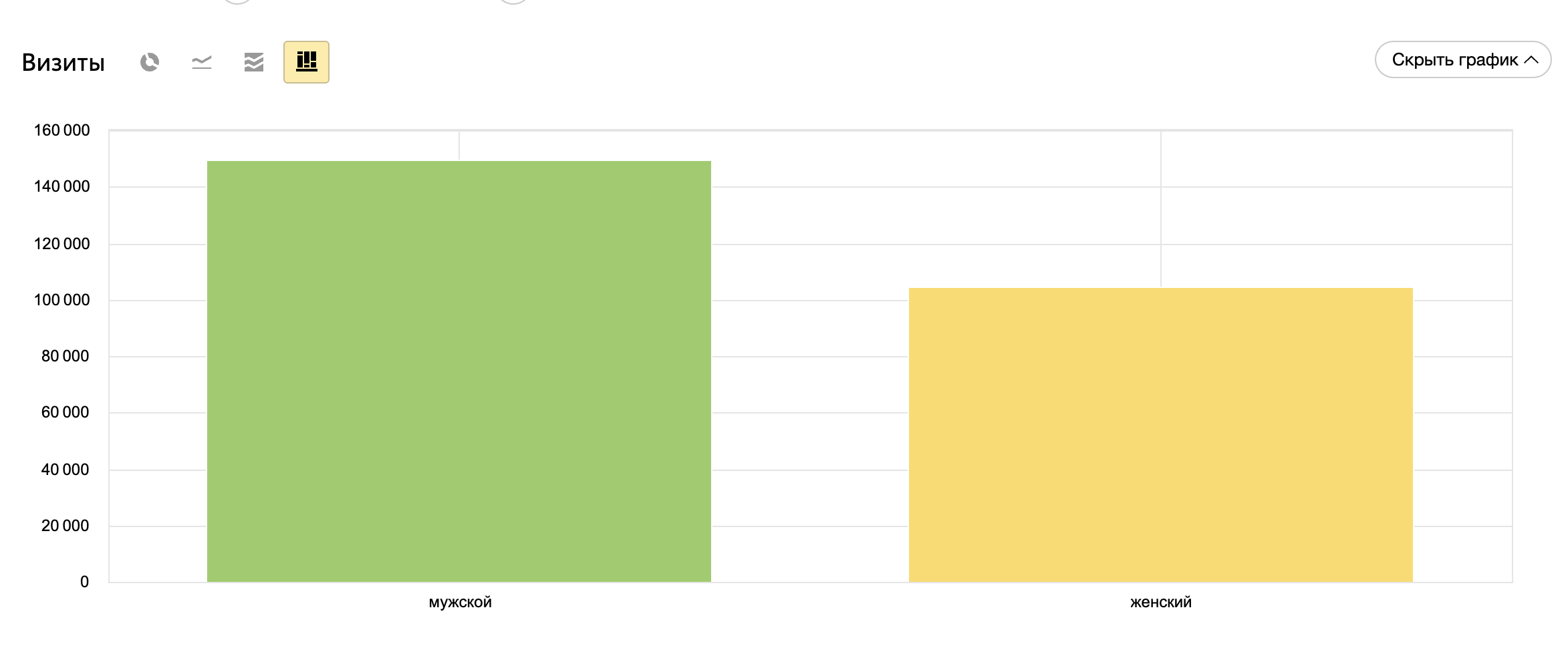 Отчёт показывает какого пола посетители. Можно узнать, кто больше проводит времени на сайте: мужчины или женщины, у кого больше глубина просмотра и кто чаще покупает.