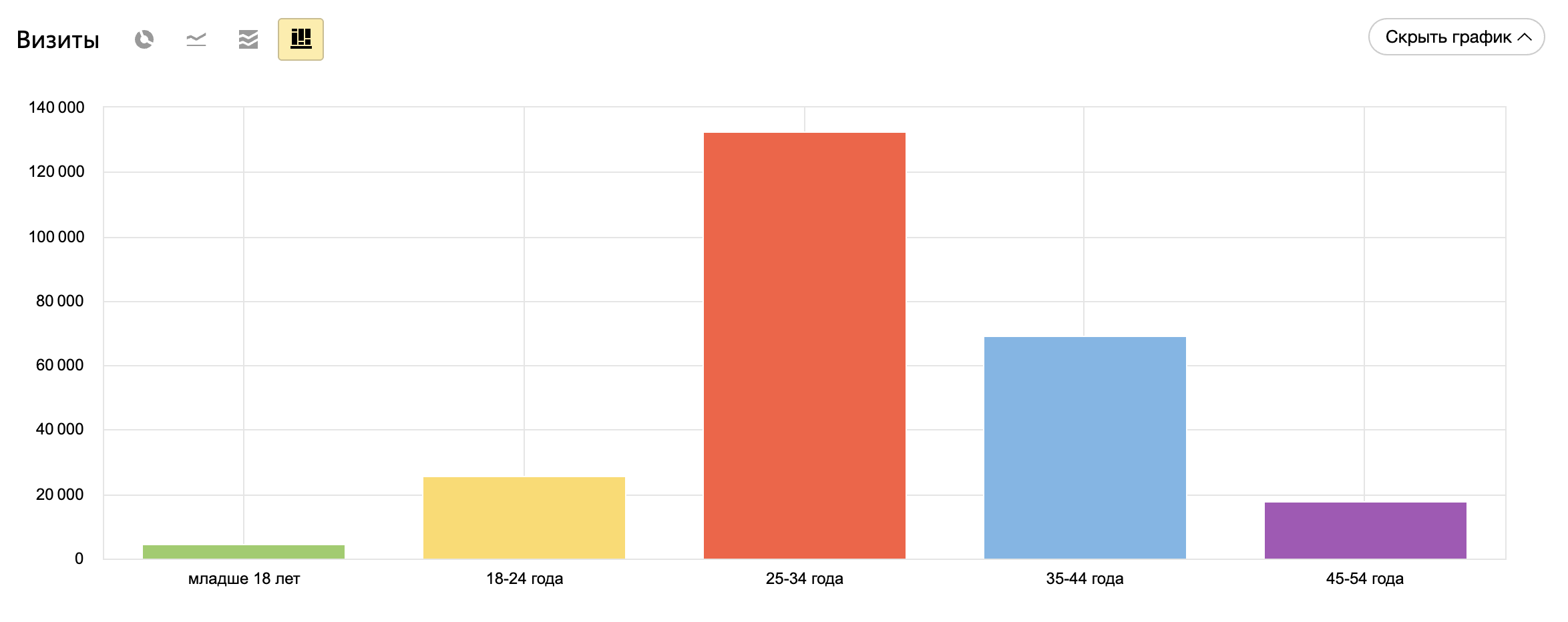 Показывает сколько лет вашим посетителям. Яндекс.Метрика определяет возраст на основе данных, полученных с помощью технологии Крипта.